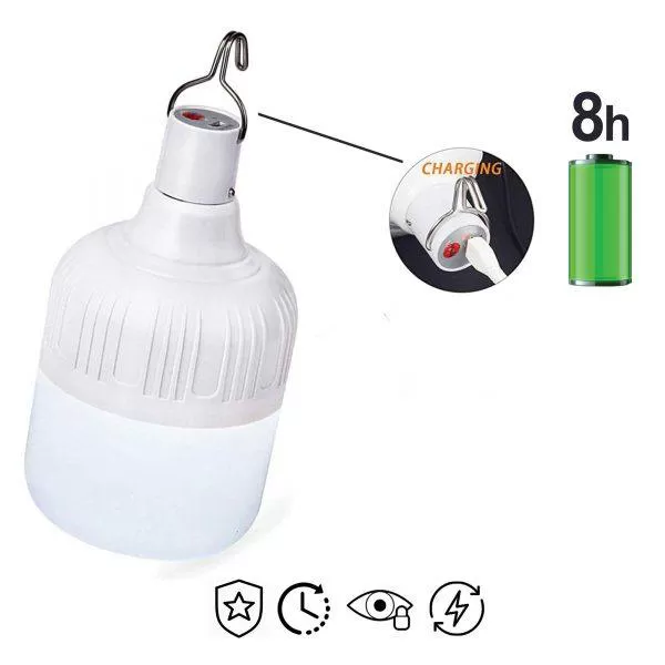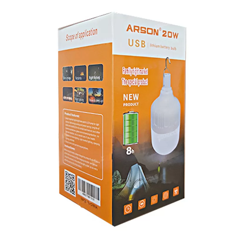 لامپ شارژی آرسون یک لامپ 20 واتی می باشد که از طریق کابل میکرو USB شارژ می شود.این لامپ 5 حالت نور دارد که شامل سه حالت شدت نور شدید،متوسط و ضعیف و همچنین دو حالت چشمک زن آهسته و تند دارد.
