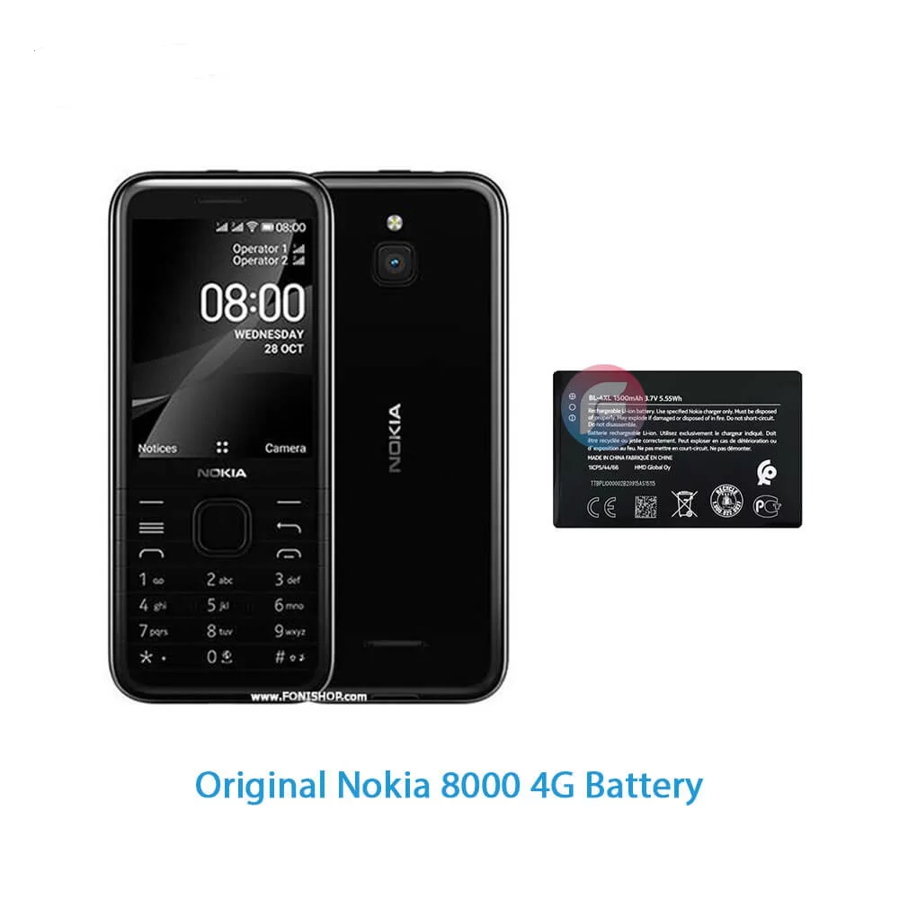 کمپانی نوکیا در باتری نوکیا Nokia 8000 4G از مدل لیتیوم یون با ظرفیت 1500 میلی آمپر استفاده کرده است.این باطری با توان 3.8 وات به کاربر این اجازه را می دهد که تا 4 ساعت مکالمه بدون وقفه را داشته باشد، همچنین کاربر میتواند 10 ساعت بی وقفه به موسیقی گوش دهد. همچنین این باطری قابل تعویض توسط کاربر میباشد و برخلاف باطری سری LUMIA داخل قاب گوشی قرار داده نشده است و براحتی