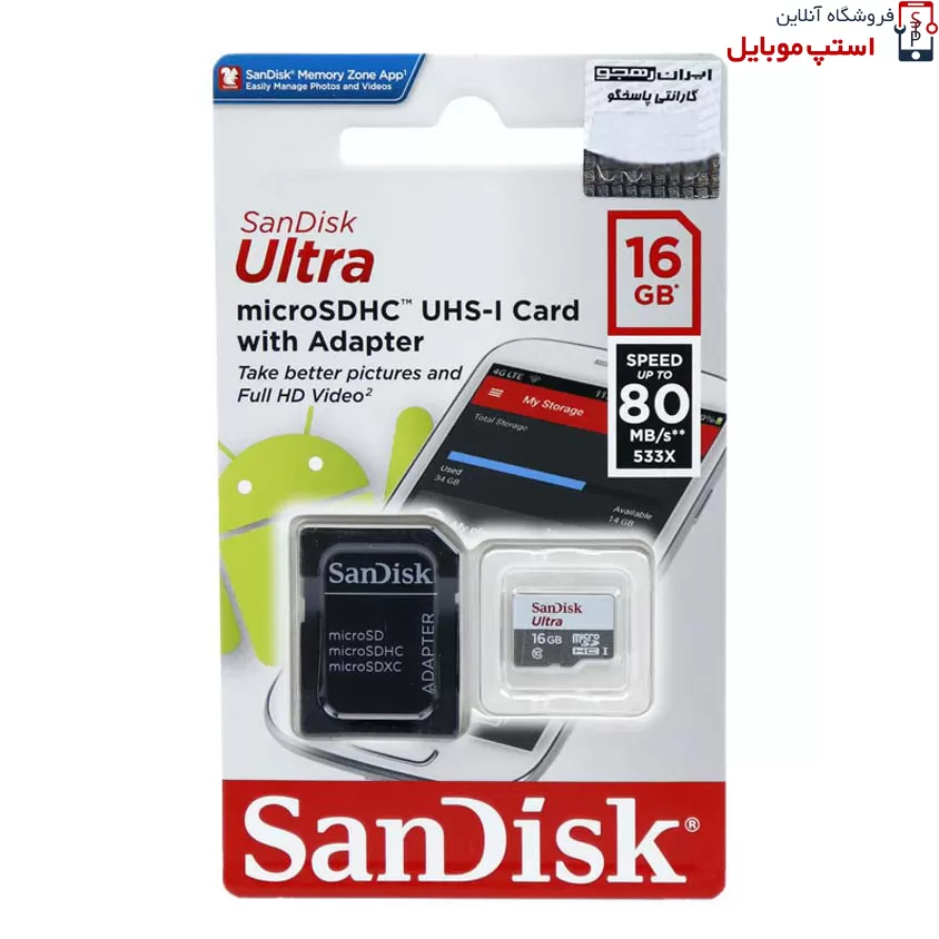 کارت حافظه سن دیسک (SanDisk) با ظرفیت 16 گیگابایت، فرمت‌ تصویری FulHD را پشتیبانی می‌کند. سرعت خواندن اطلاعات در این محصول 80 مگابایت بر ثانیه است. به همراه این کارت‌ حافظه، یک آداپتور SD هم به بازار عرضه شده است تا در مواردی که کاربر به به‌ ابعاد SD نیاز دارد، بتواند از آن استفاده کند. این کارت حافظه microSD در برابر ضربه، پرتو X و گرما مقاوم است. کارت‌های حافظه microSD کوچک‌تر از حافظه‌های
