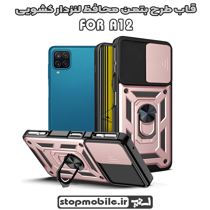 این قاب همانطور که از نام آن پیدا است، در مقابل ضربه ایمنی خوبی از خود نشان می‌دهد. قاب گوشی گلکسی ای ۱۲ مدل ضد ضربه انگشتی به دلیل طراحی خاصی که دارد، از دست سر نمی‌خورد. این کاور موبایل از جنس پلی کربنات و پلی اورتان و در برابر ضربه و خط و خش مقاوم است. بالا، پایین، لبه‌ها و همچنین دکمه‌های گوشی را کاملا تحت پوشش قرار می‌دهد. علاوه بر بدنه گوشی، لبه‌های برجسته قاب هولدر دار سامسونگ A12 ایمنی بیشتری برای نمایشگر و دوربین گوشی ایجاد می‌کند. پس اگر نگران ایجاد خط و خراش برای روی لنز دوربین یا نمایشگر گوشی هستید، این قاب می‌تواند تا حدودی خیال شما را راحت کند. این کاور ضد ضربه برشی دقیق مطابق با ابعاد گوشی دارد و محدودیتی در دسترسی به درگاه‌های اسمارت فون شما ایجاد نمی‌کند. همانطور که مشاهده می‌کنید کناره‌های قاب دارای بامپری از جنس TPU است که به راحتی مانع از آسیب رسیدن به لبه‌های گوشی شما می‌شود. گارد بتمنی کشویی