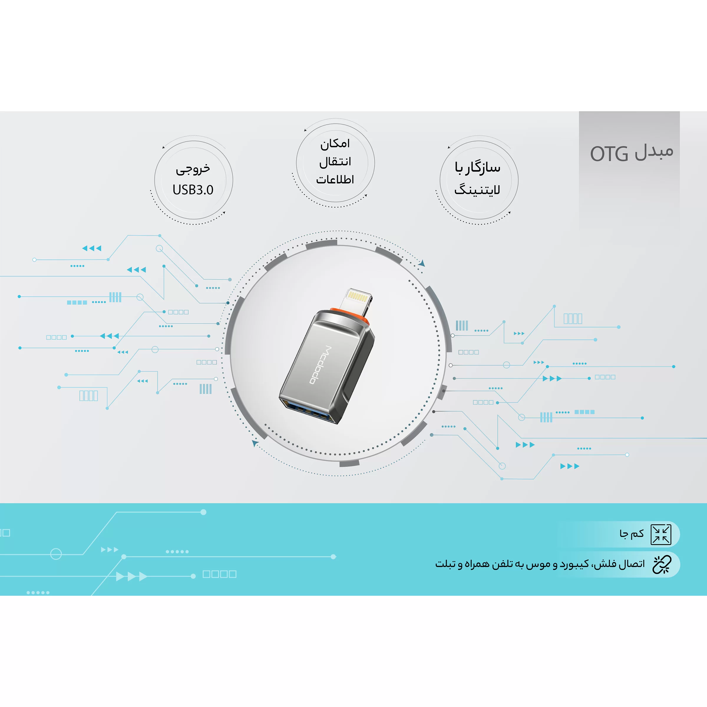 در تبدیل او تی جی آیفون Mcdodo OT-8600 پورت USB 3.0 سرعت انتقال دادهی 480 مگابایت بر ثانیه دارد. با مبدل OTG مکدودو OT-8600 انتقال اطلاعات از گوشی راحتتر خواهد شد. با این مبدل دیگر برای انتقال داده نیازی به مکبوک، لپتاپ یا کامپیوتر ندارید.