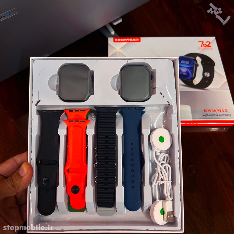محتویات بستهبندی پک ساعت هوشمند دو تایی KEQIWEAR مدل KW36 MAX با 7 مدل بند
